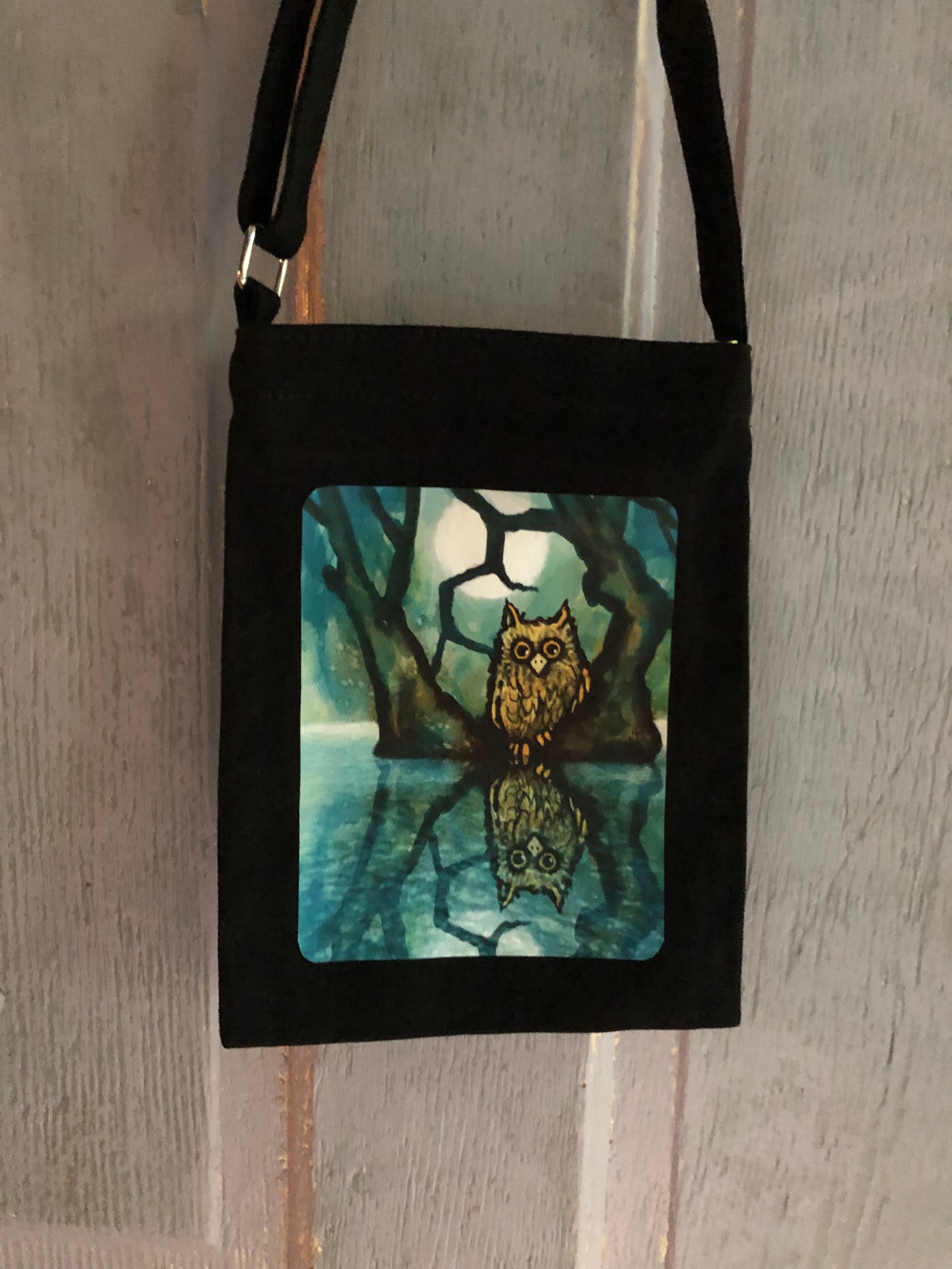 My original art on a crossbody bag. The bag is black canvas, 9” x 7” body with a zipper closure. It has an adjustable shoulder strap with a 12” to 23- 1/4” drop.
