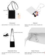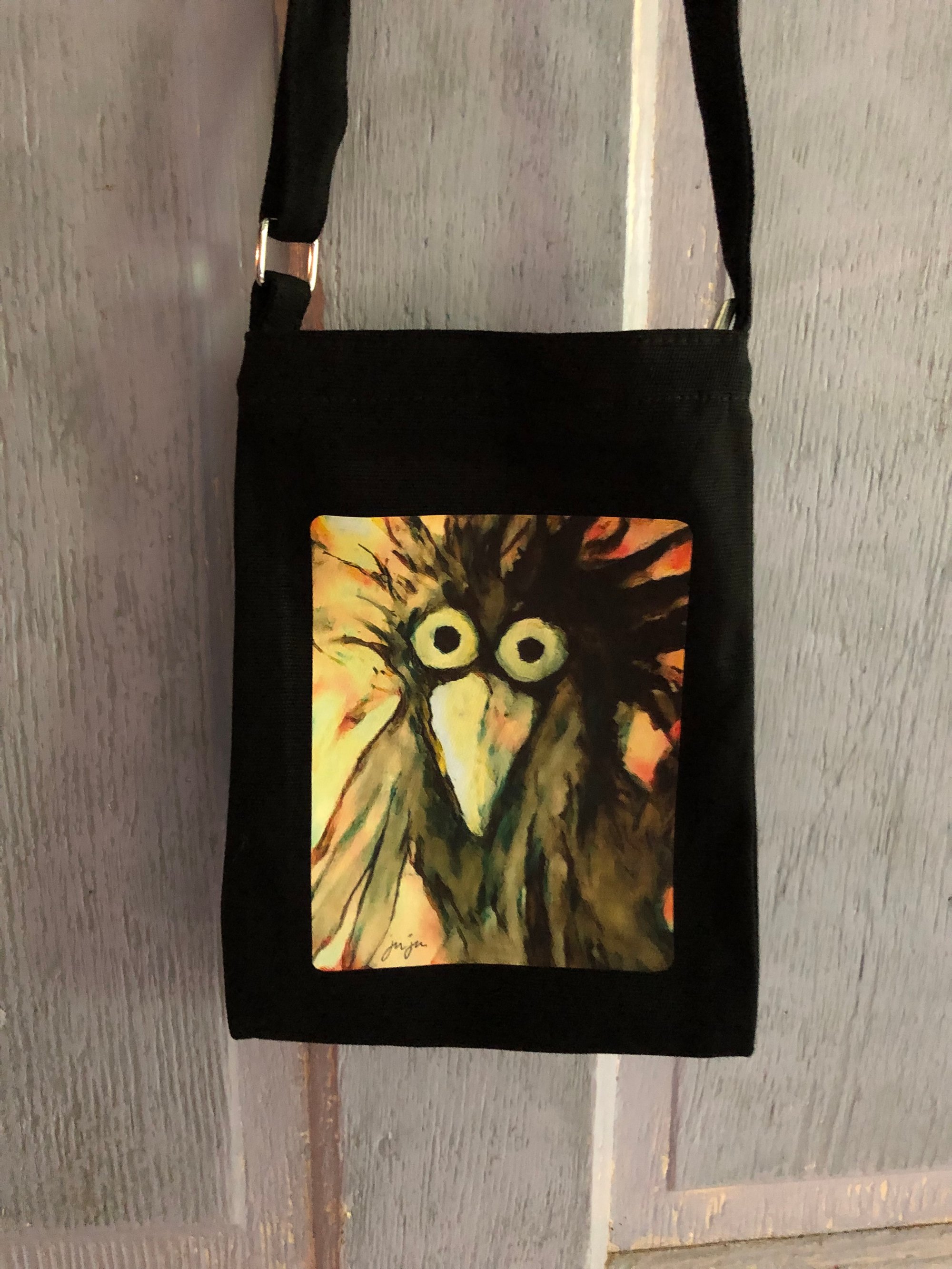 My original art on a crossbody bag. The bag is black canvas, 9” x 7” body with a zipper closure. It has an adjustable shoulder strap with a 12” to 23- 1/4” drop.